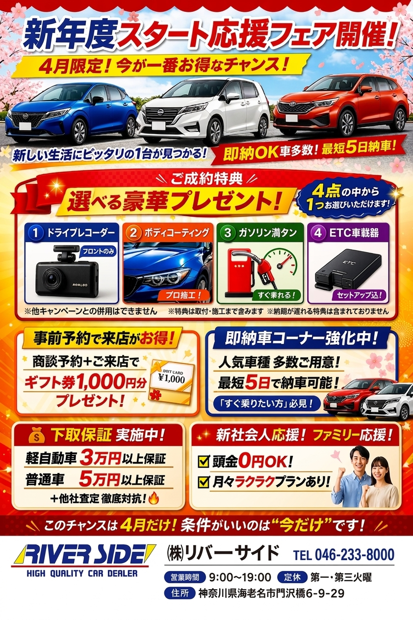 即納OK車多数展示!最短5日納車可能! 4月限定のお得なキャンペーンも実施中!