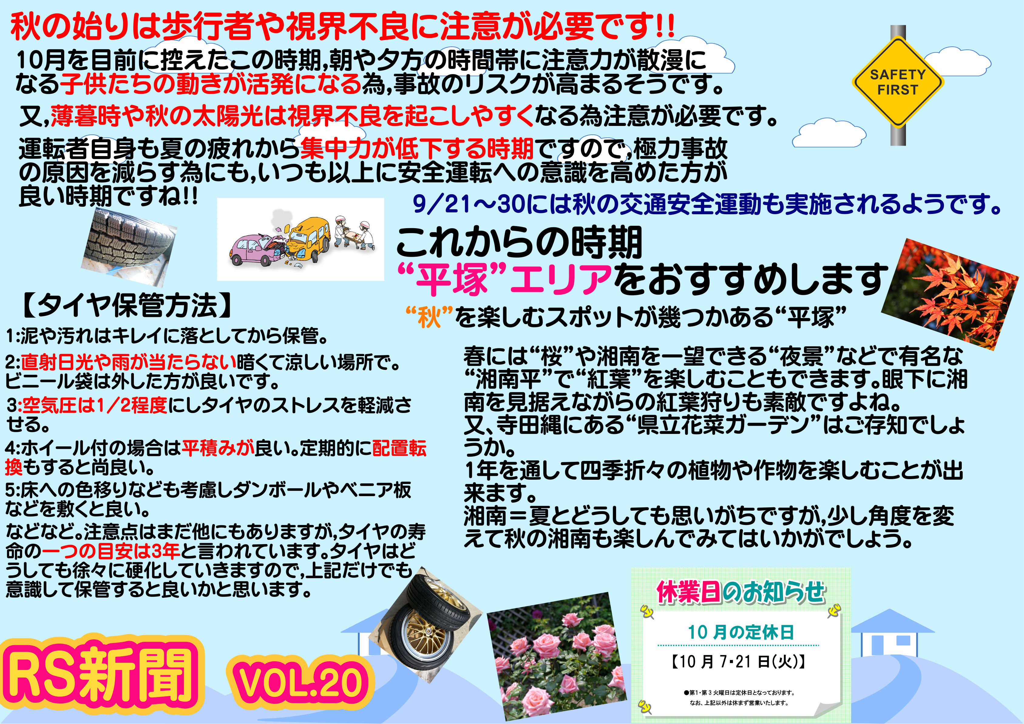 RS新聞VOL20を掲載します。 今月は「秋の視界不良」「タイヤの保管方法」 など 是非ご一読ください!