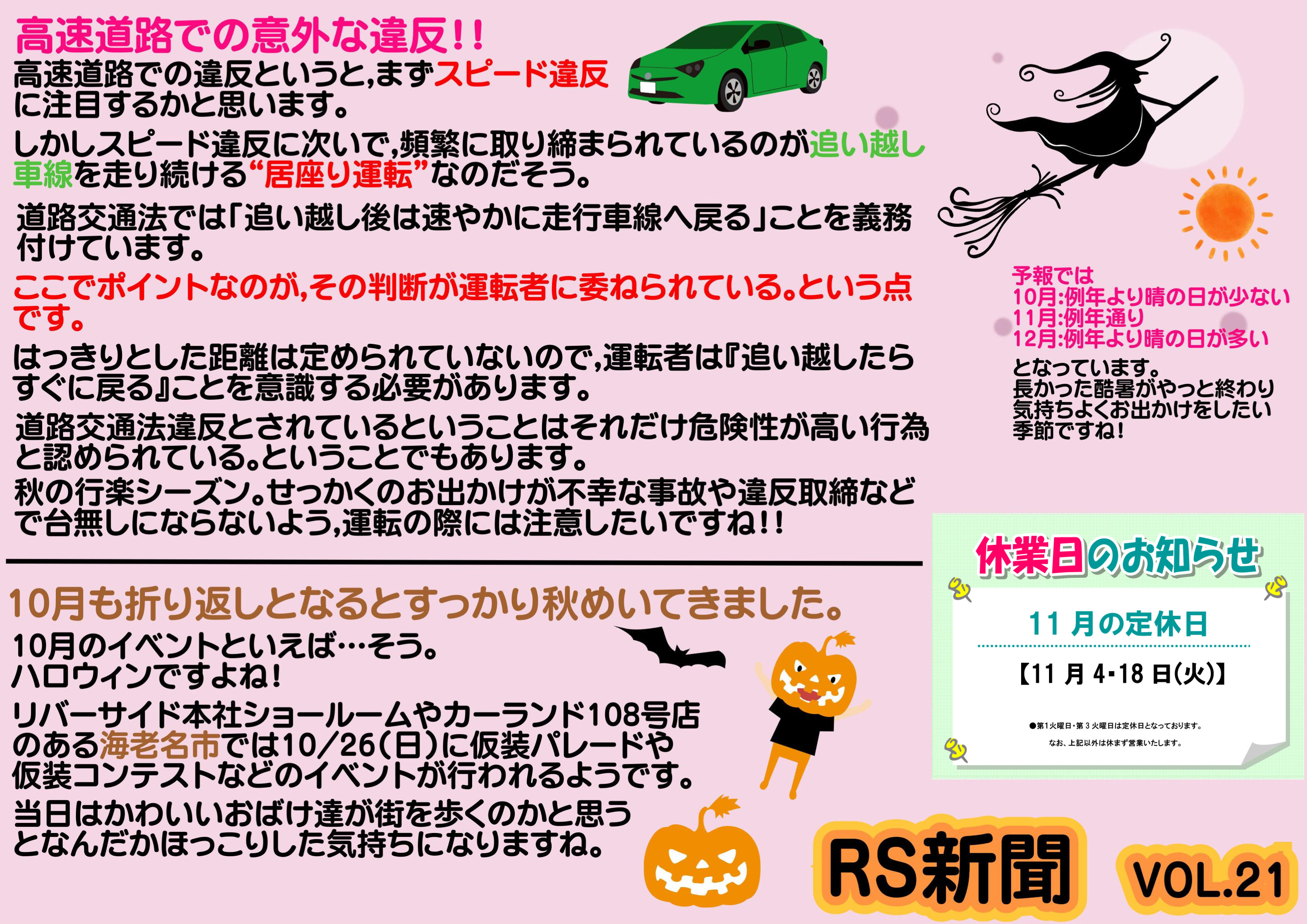 RS新聞VOL21を掲載します。 今月は「気をつけたい意外な高速道路の違反」 など 是非ご一読ください!